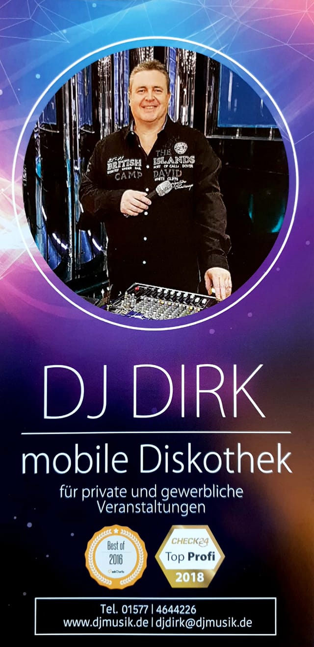 Mein Name ist Dirk Sprenzyna (DJ Dirk) und ich biete Ihnen für Ihre Veranstaltung, egal ob private Familienfeier mit 40 Personen , dem Firmenevent mit über 100 Personen oder der Großveranstaltung im Schützenzelt mit 600 Personen oder mehr, nicht nur die richtige Licht- und Tontechnik, sondern dazu auch die passende Moderation.